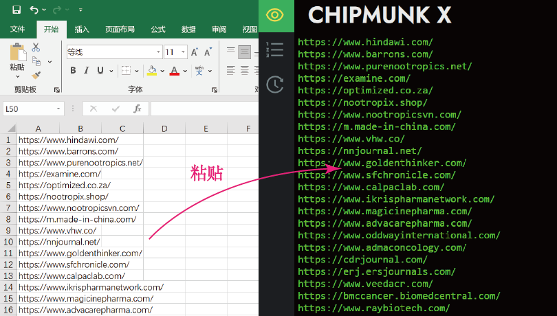 将客户网址准备在电子表格或文本文档中,每行一条网址,然后 批量粘贴到 Chipmunk X,每行一条网址,无需标点符号间隔。
