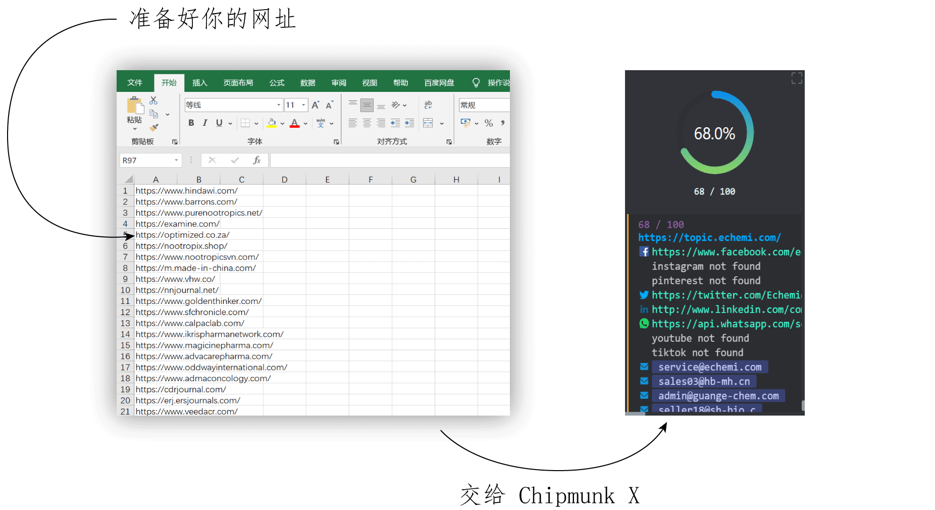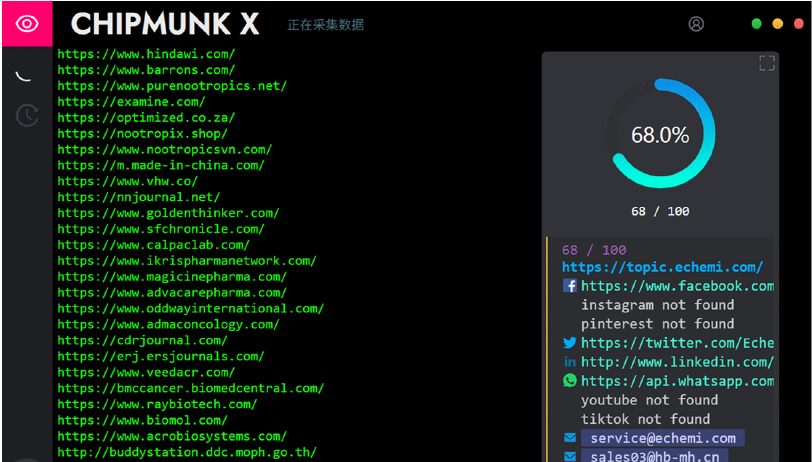 推荐的方式是,将客户网址准备在电子表格或文本文档中,每行一条网址,无需标点符号分隔。然后批量粘贴到 Chipmunk X。当然,如果您只需要采集一条网站,手动直接输入也可。但通常推荐先将多个客户的官网一起准备好,再一键批量采集,更高效。它将自动地帮您搜寻每条您的客户官网中的联系方式,而无需您逐条整理。