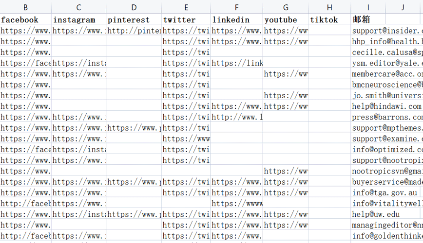 导出的表格可以打开,包含日期,和各客户官网中的 facebook/instagram ... 等社媒链接,和 邮箱。